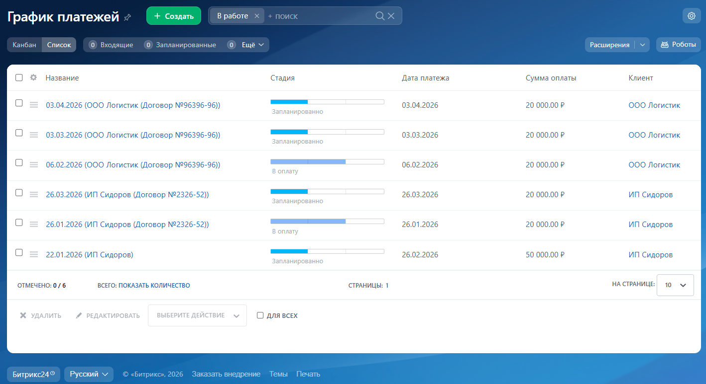 Для оптимизации работы Финансового отдела в систему интегрирован График платежей, где фиксируются запланированные оплаты по договорам с внешними подрядчиками и другие регулярные платежи, включая те, что создаются вручную. Когда наступает дата платежа, CRM автоматически формирует запрос на оплату в соответствующем направлении Расходов и платежей, заполняя все необходимые данные по платежу.