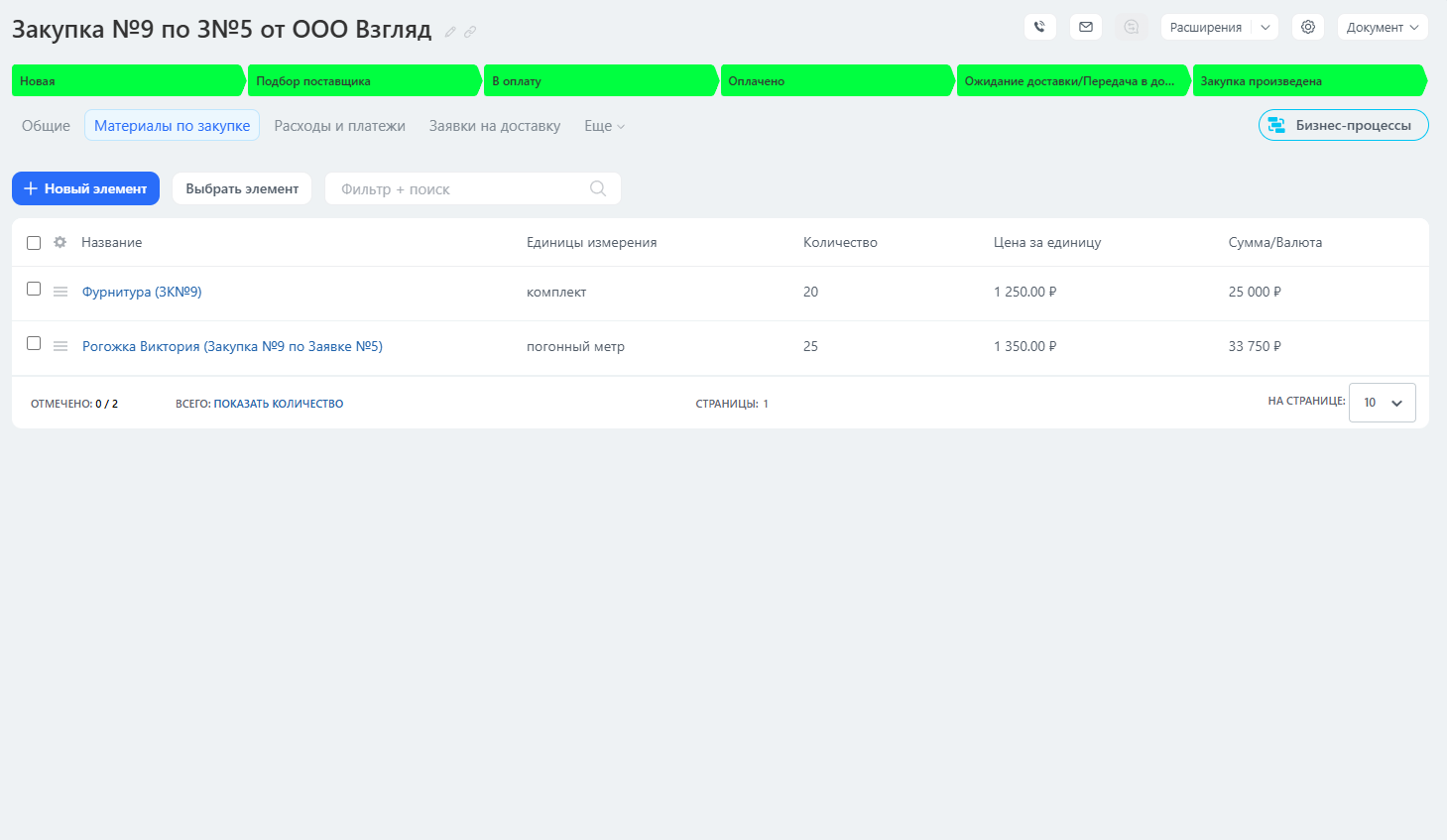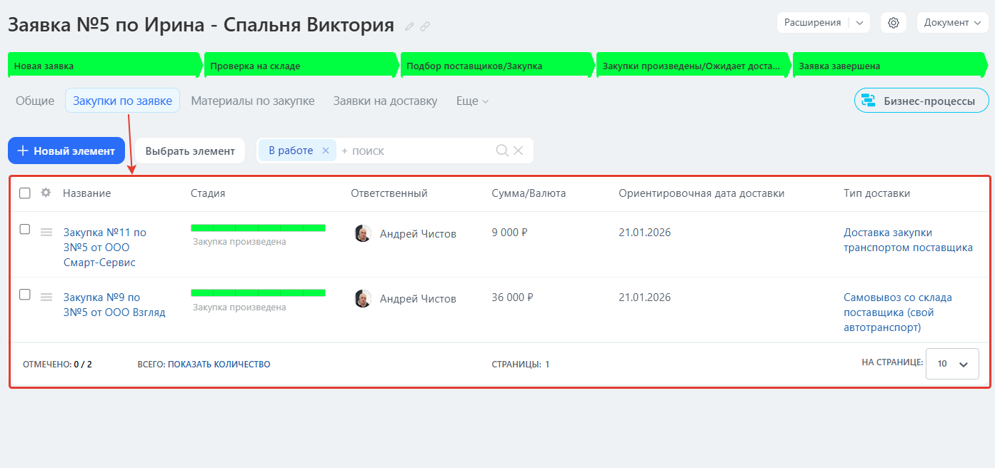 В процессе работы с карточками заявок и закупок были внедрены дополнительные интеграции, связывающие их с объектами смежных подразделений. Это включает заявки на доставку, оплаты по закупкам, а также списки материалов, относящихся как к закупке, так и к заявке.
