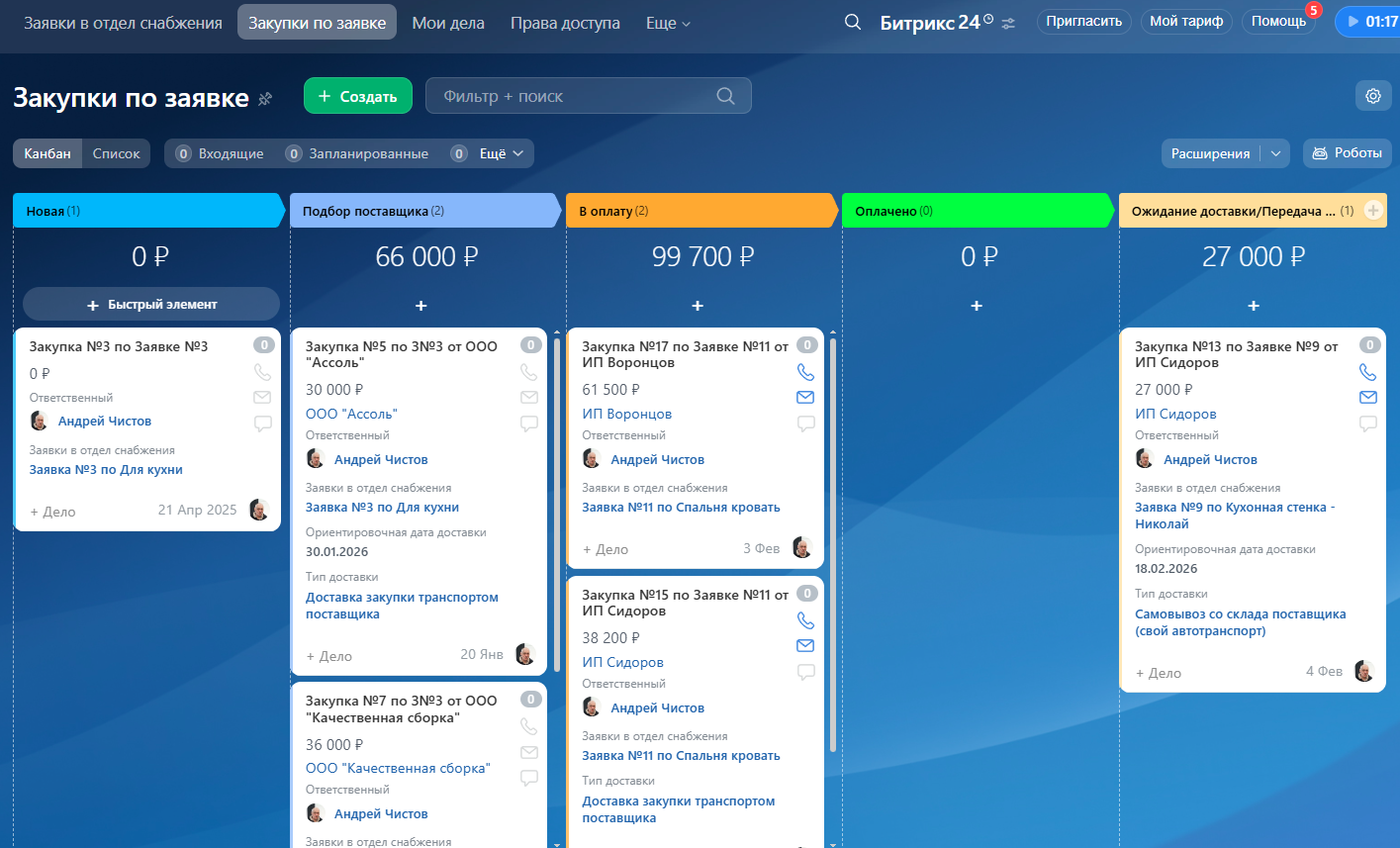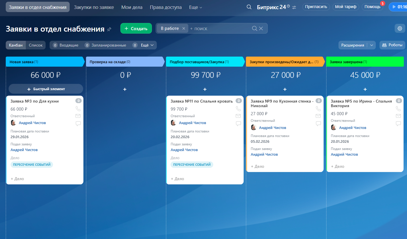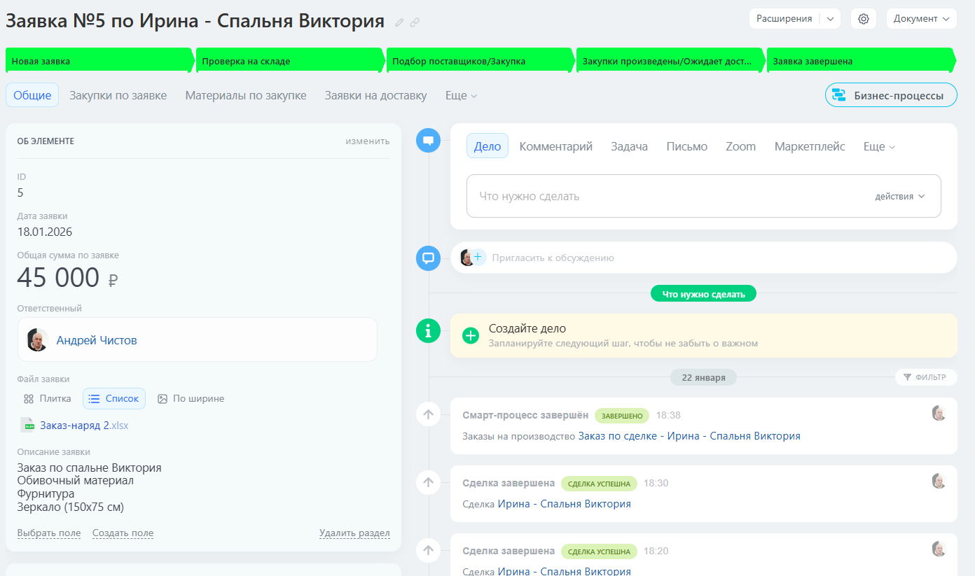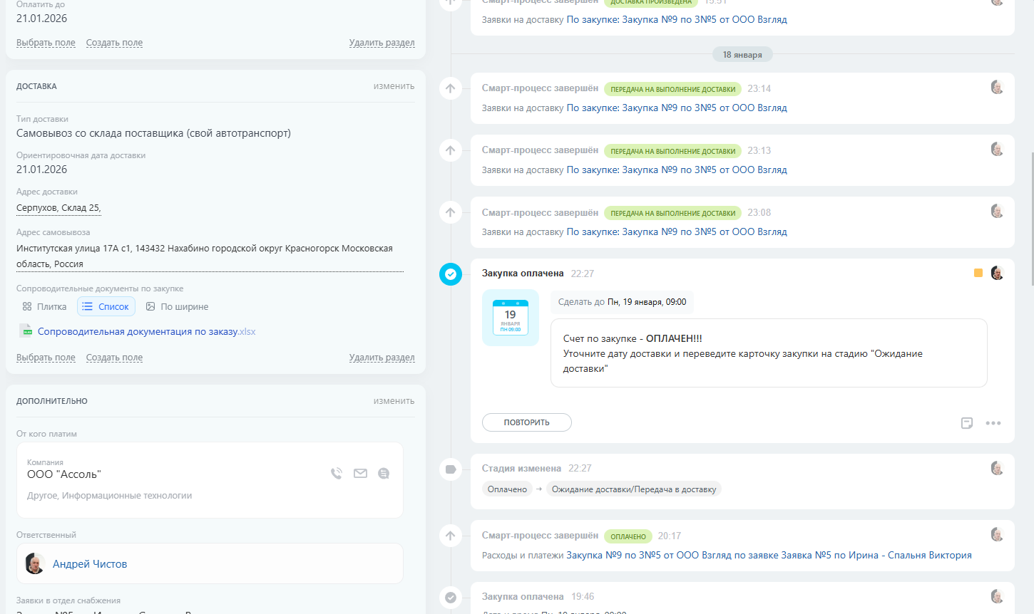 Для обработки заявок отделом снабжения предусмотрены специальные этапы. В карточке заявки созданы все необходимые поля для ввода данных.